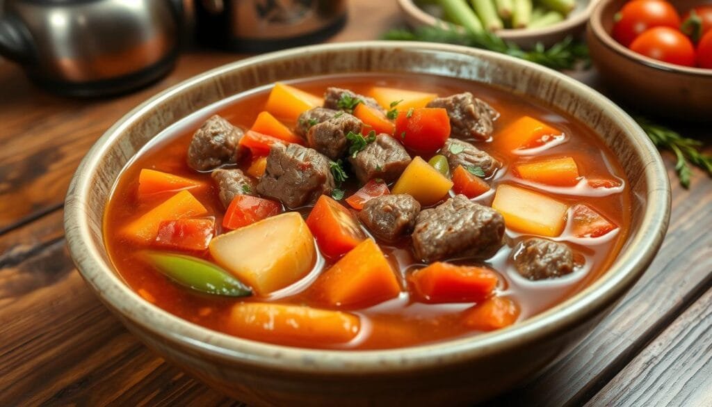 This vegetable beef soup recipe is not just tasty; it’s also healthy. It has a rich broth and lots of good ingredients. It’s a meal that will make you feel full and energized.