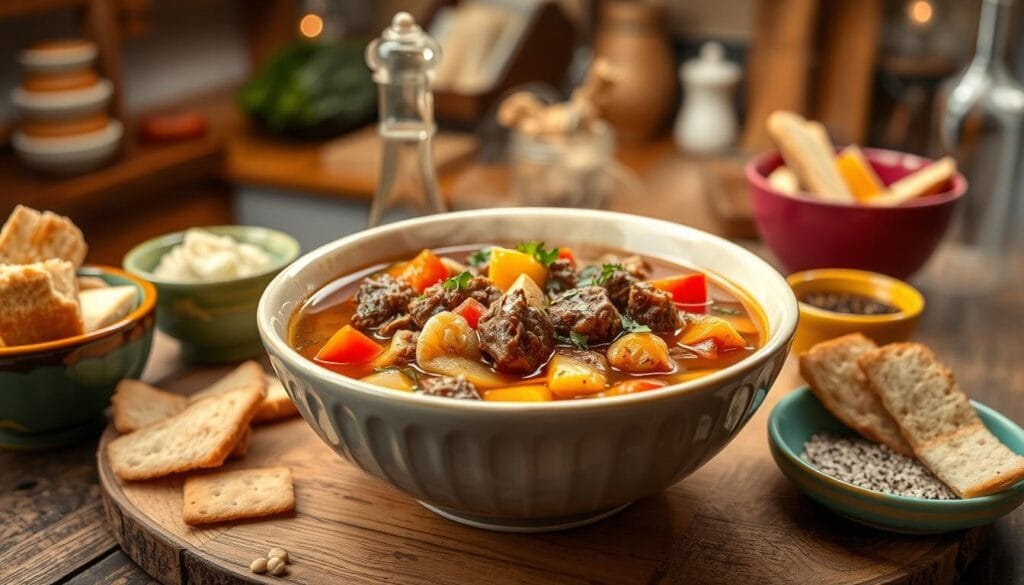 This soup is full of nutrients. The beef gives protein, and veggies offer vitamins, minerals, and fiber. It’s great for your health and taste.