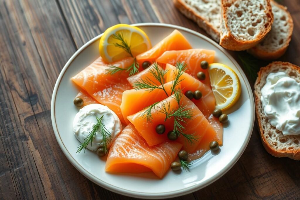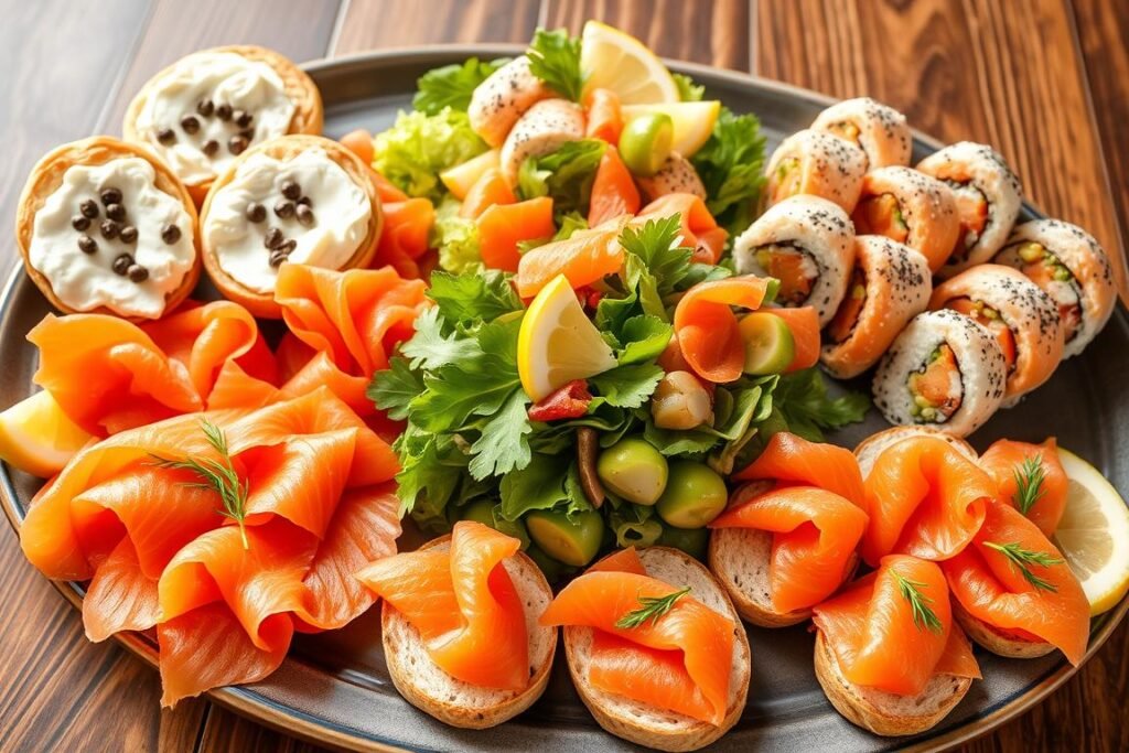 For something fancy, make Smoked Salmon Mousse Canapes. They are light and show off the salmon’s flavor. Also, try Smoked Salmon Frittata for a filling breakfast or brunch. It’s packed with protein and tastes amazing.